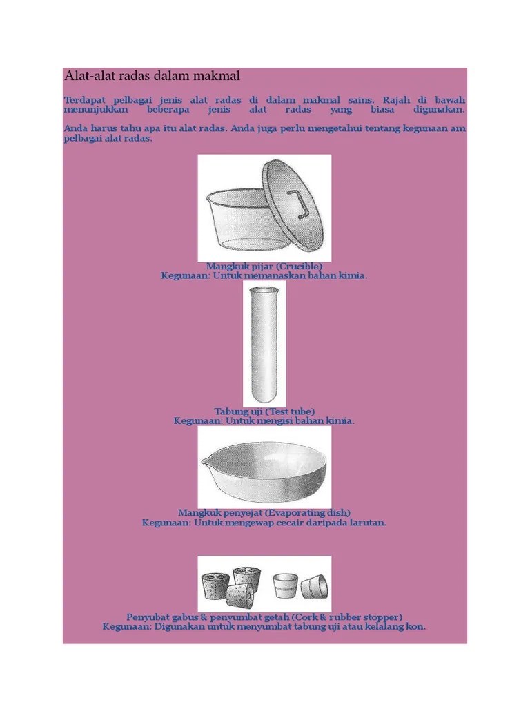 Video ini menerangkan 14 alat radas makmal dan fungsinya mengikut sukatan kssm alatan makmal sains. Disebabkan ujikaji selalu melibatkan reaksi kimia yang berbahaya, maka alat yang .